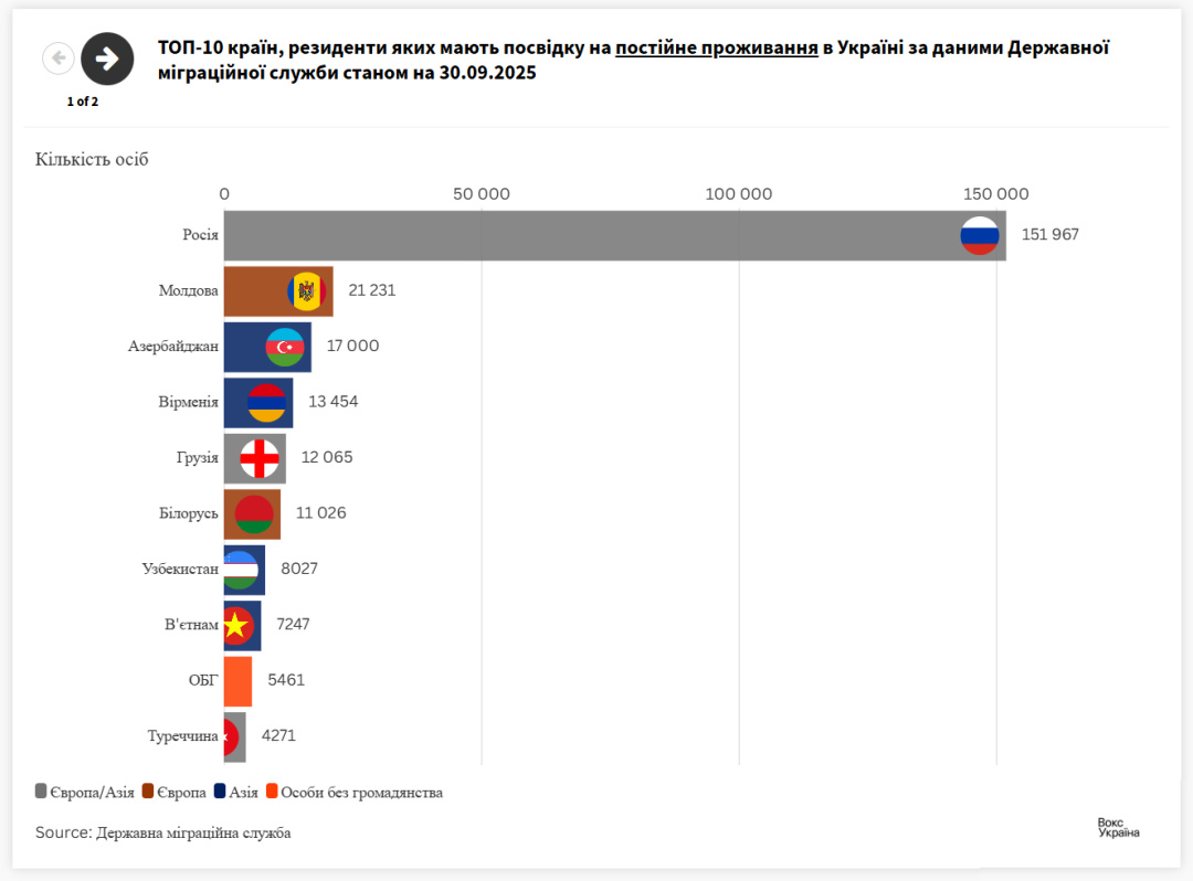 Рисунок 6. ТОП-10 країн, резиденти яких мають посвідку на постійне та тимчасове проживання в Україні за даними Державної міграційної служби станом на 30.09.2025