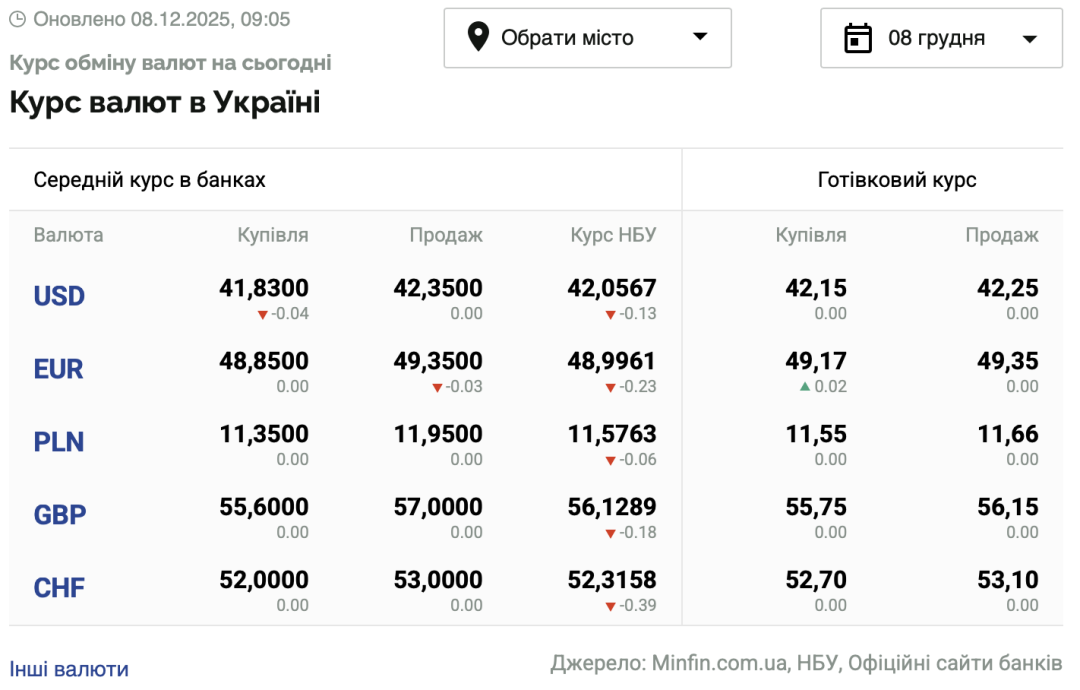 - 1 долар США – 42,05 грн (42,18 грн станом на 5 грудня);