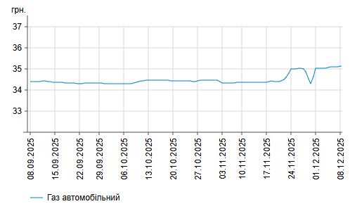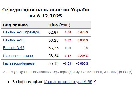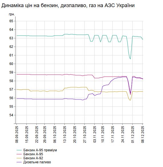 Зокрема, зафіксовано такі середні ціни на пальне: бензин марки А-95 (преміум) - 62,87 грн/л (здешевшав на 30 коп.); бензин марки А-95 - 58,28 грн/л (здешевшав на 2 коп.); бензин марки А-92 - 56,75 грн/л; дизельне пальне - 58,24 грн/л (здешевшало на 12 коп.). Середня ціна автогазу становить 35,13 грн/л, що на 3 коп. більше порівняно із попереднім робочим днем - 5 грудня.