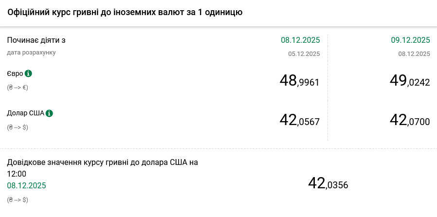 1 долар США – 42,07 грн (42,05 грн станом на 8 грудня);