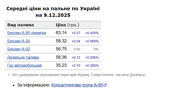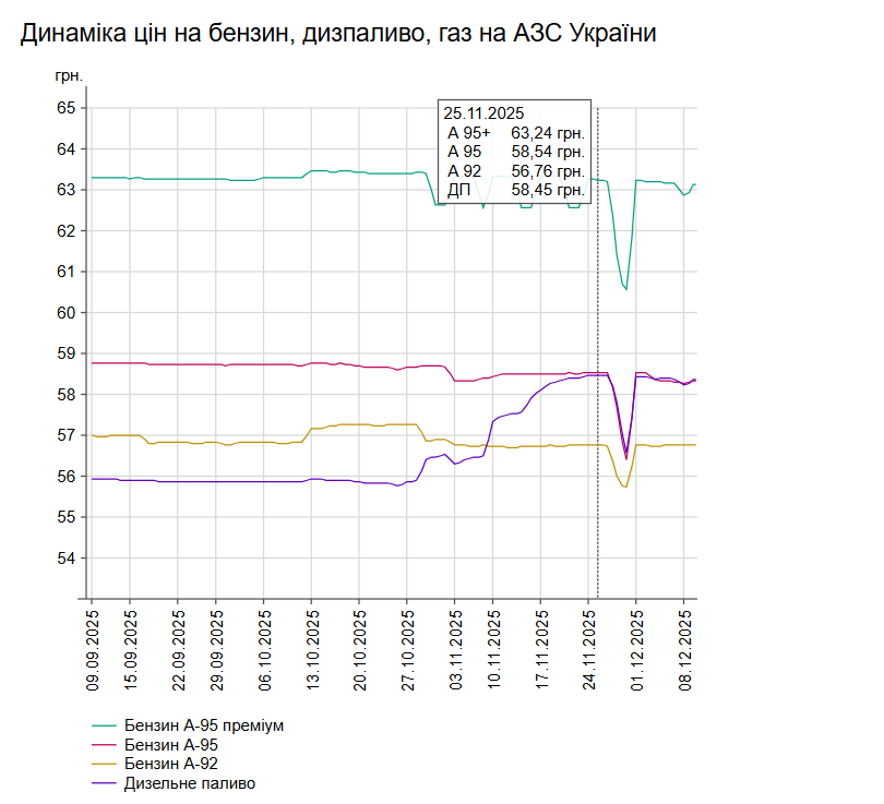 Як повідомлялось, у понеділок, 8 грудня, середня ціна на бензин марки А-95 знизилася на 2 коп. до 58,28 грн/л, на дизельне пальне - на 12 коп. до 58,24 грн/л.