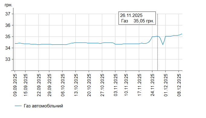 Зокрема, зафіксовано такі середні ціни на пальне: бензин марки А-95 (преміум) - 63,14 грн/л (здорожчав на 27 коп.); бензин марки А-95 - 58,32 грн/л (здорожчав на 4 коп.); бензин марки А-92 - 56,75 грн/л; дизельне пальне - 58,36 грн/л (здорожчало на 12 коп.). Середня ціна автогазу становить 35,23 грн/л, що на 10 коп. більше порівняно із попереднім днем.