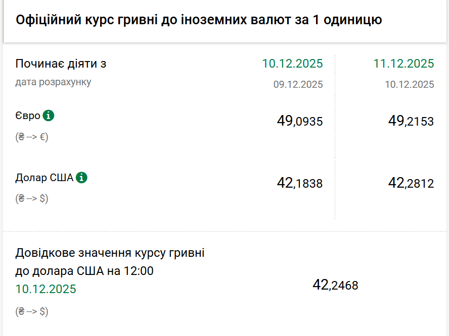 Офіційні курси валют на четвер, 11 грудня, становитимуть: