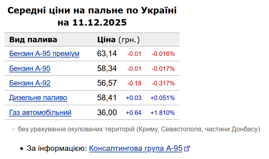 Зокрема, зафіксовано такі середні ціни на пальне: бензин марки А-95 (преміум) - 63,14 грн/л (здешевшав на 1 коп.); бензин марки А-95 - 58,34 грн/л (здешевшав на 1 коп.); бензин марки А-92 - 56,57 грн/л (здешевшав на 18 коп.); дизельне пальне - 58,41 грн/л (здорожчало на 3 коп.). Середня ціна автогазу становить 36 грн/л, що на 64 коп. більше порівняно із попереднім днем.