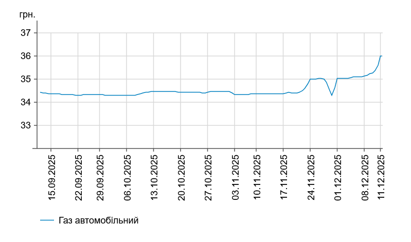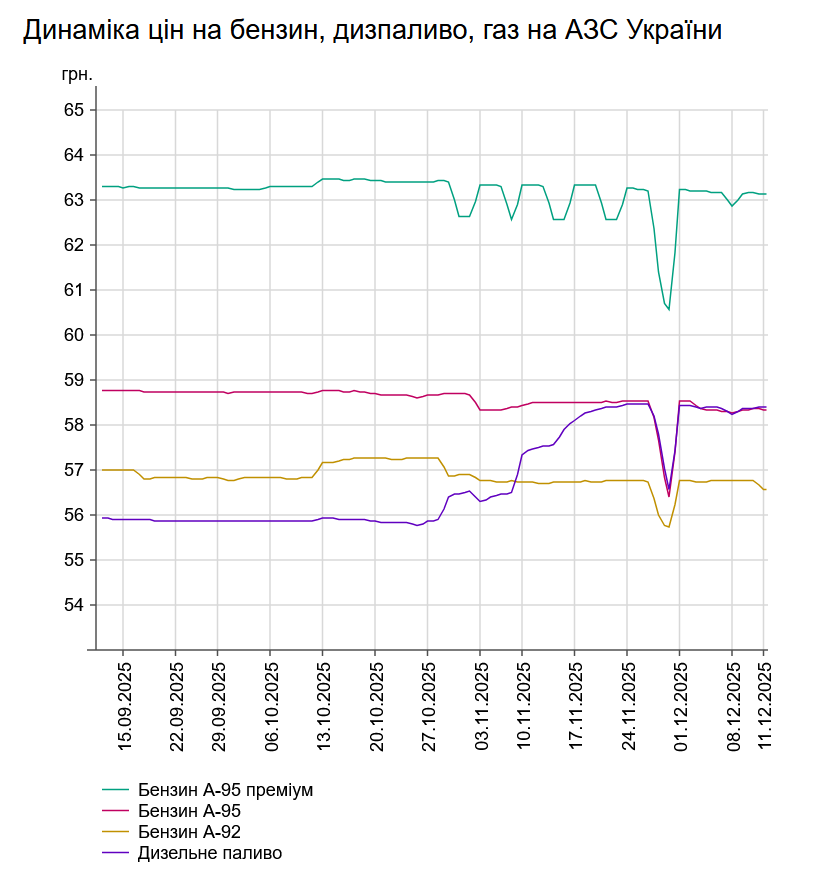 Як повідомлялось, у середу, 10 грудня, середня ціна на бензин марки А-95 зросла на 3 коп. до 58,35 грн/л, на дизельне пальне - на 2 коп. до 58,38 грн/л.