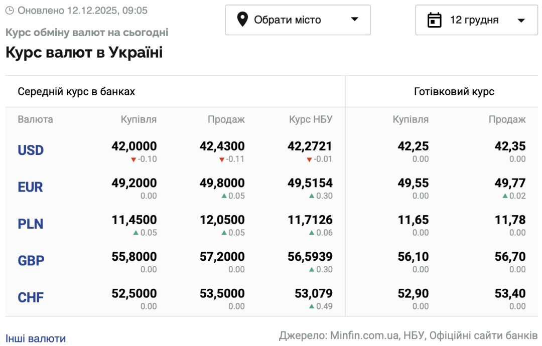 - 1 долар США – 42,27 грн (42,28 грн станом на 11 грудня);
