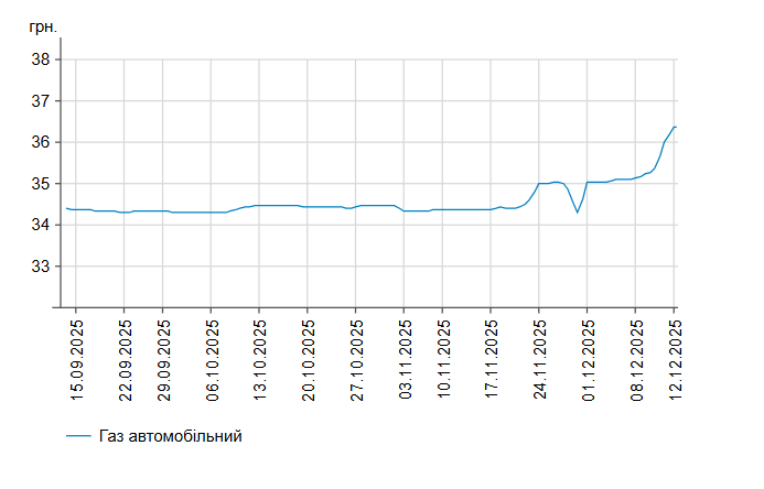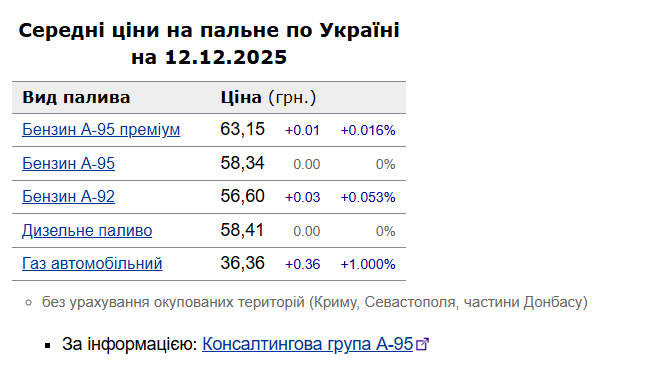 Як повідомлялось, у четвер, 11 грудня, середня ціна на бензин марки А-95 знизилася на 1 коп. до 58,34 грн/л, на дизельне пальне - зросла на 3 коп. до 58,41 грн/л.