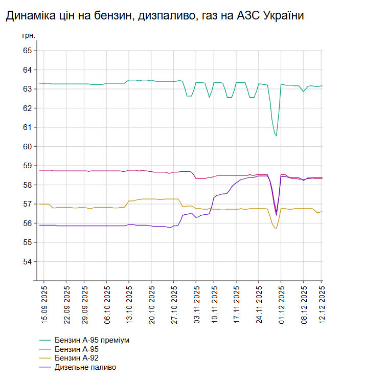 Зокрема, зафіксовано такі середні ціни на пальне: бензин марки А-95 (преміум) - 63,15 грн/л (здорожчав на 1 коп.); бензин марки А-95 - 58,34 грн/л; бензин марки А-92 - 56,6 грн/л (здорожчав на 18 коп.); дизельне пальне - 58,41 грн/л. Середня ціна автогазу становить 36,36 грн/л, що на 36 коп. більше порівняно із попереднім днем.