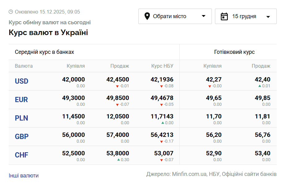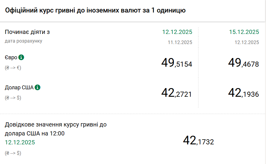 - 1 долар США – 42,19 грн (42,27 грн станом на 12 грудня);