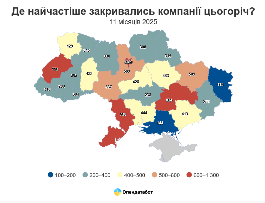 Найчастіше компанії згортались у Києві — 1 289 припинень, або 12% від загальної кількості. Далі — Дніпропетровщина (824 закриття), Львівщина (772), Одещина (738) та Київщина (589).