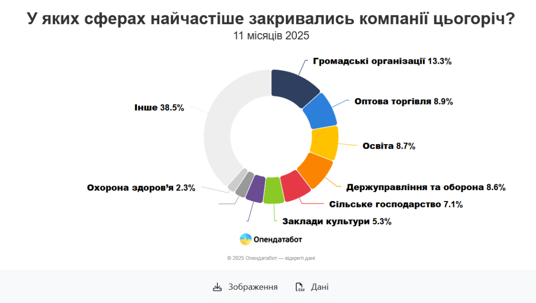 За кількістю закриттів лідирують громадські організації – 1 498 серед них з початку року припинили роботу. Значні втрати спостерігаються й в оптовій торгівлі (1 001 компанія), освіті (981), державному управлінні та обороні (966) і у сільському господарстві (794).