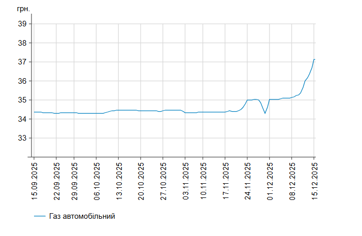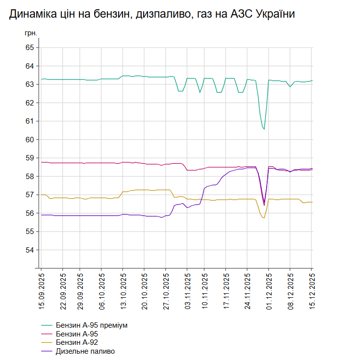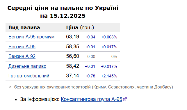 Як повідомлялось, у п'ятницю, 12 грудня, середня ціна на бензин марки А-95 зафіксована на рівні 58,34 грн/л, на дизельне пальне - на рівні 58,41 грн/л.