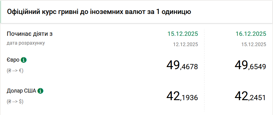 - 1 євро – 49,65 грн (49,46 грн станом на 15 грудня).