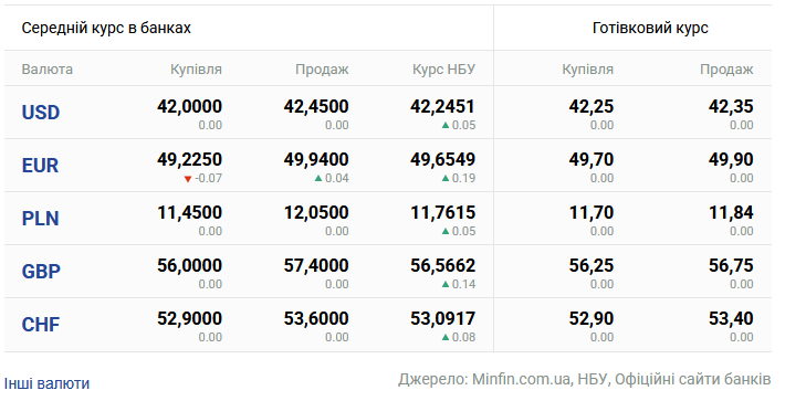 - у monobank: 42,00 - 42,36 грн/$ та 49,30 - 49,95 грн/EUR.