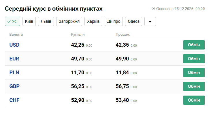 - 1 долар США – 42,24 грн (42,19 грн станом на 15 грудня);