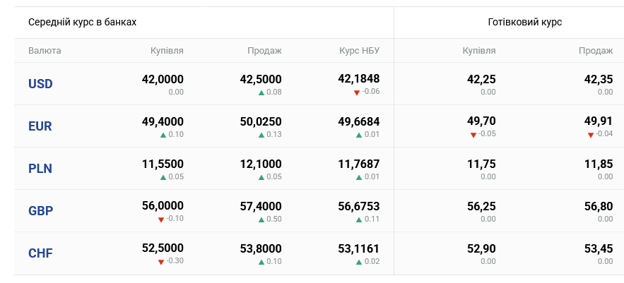у monobank: 42,00 - 42,36 грн/$ та 49,35 - 49,99 грн/EUR.