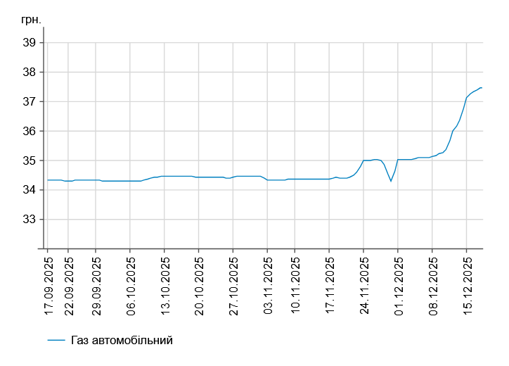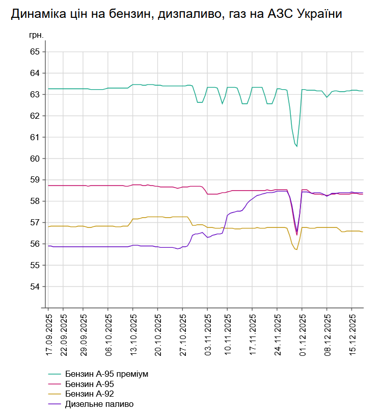 Зокрема, зафіксовано такі середні ціни на пальне: бензин марки А-95 (преміум) - 63,17 грн/л (здешевшав на 2 коп.); бензин марки А-95 - 58,34 грн/л (здешевшав на 1 коп.); бензин марки А-92 - 56,57 грн/л (здешевшав на 3 коп.); дизельне пальне - 58,41 грн/л. Середня ціна автогазу становить 37,45 грн/л, що на 11 коп. більше порівняно з минулим днем.