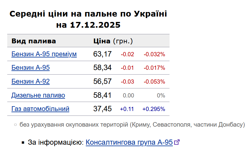 Як повідомлялось, у вівторок, 16 грудня, середня ціна на бензин марки А-95 залишається 58,35 грн/л, дизельне пальне - знизилася на 1 коп. до 58,41 грн/л.