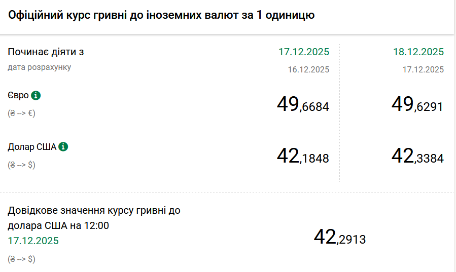 - 1 євро – 49,62 грн (49,66 грн станом на 17 грудня).