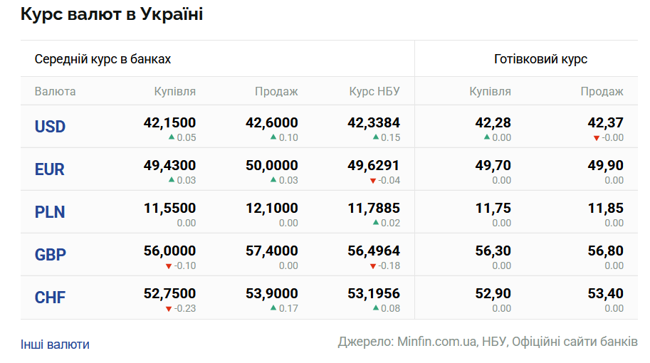 - у monobank: 42,15 - 42,54 грн/$ та 49,35 - 49,99 грн/EUR.