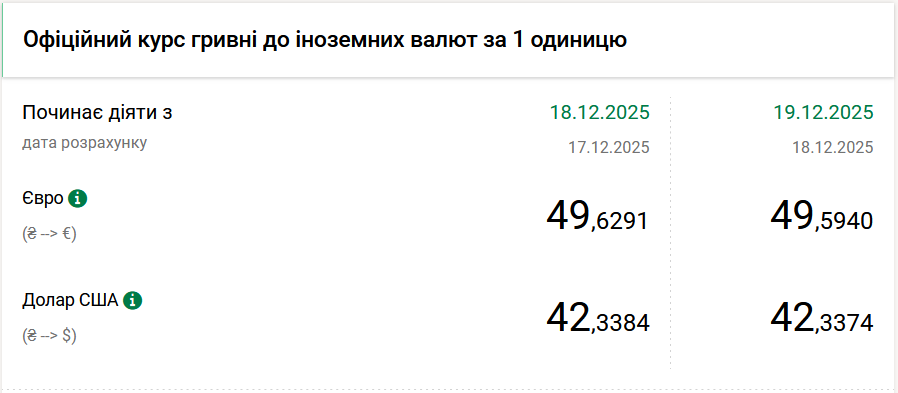 - 1 євро – 49,59 грн (49,62 грн станом на 18 грудня).