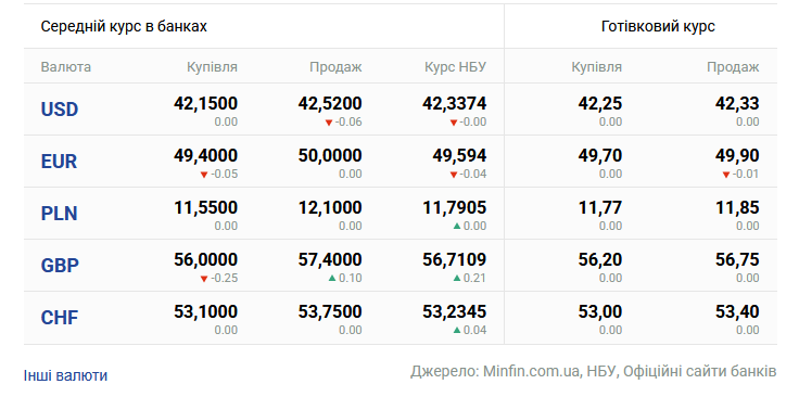 - у monobank: 42,10 - 42,54 грн/$ та 49,30 - 49,99 грн/EUR.