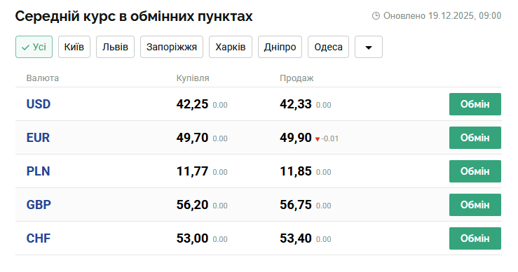 Офіційні курси валют на п'ятницю, 19 грудня, становлять: