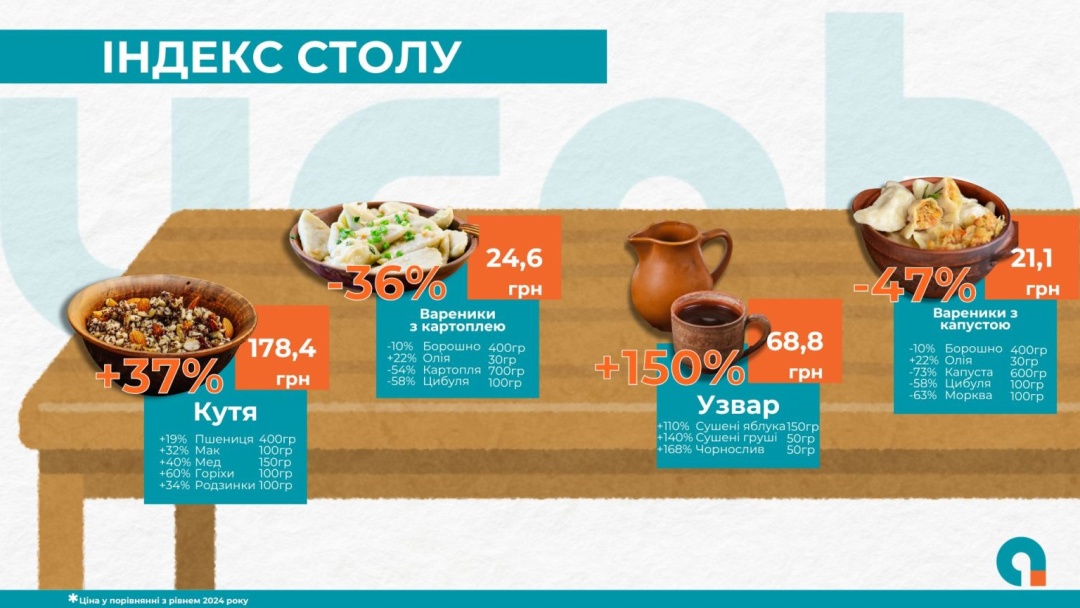 "Однак, попри дешеву городину, основні символи різдвяного столу – кутя та узвар – помітно додали в ціні. Індекс куті зріс на 37%. Це зумовлено подорожчанням усіх її складових: горіхи зросли в ціні на 60%, мед – на 40%, а мак та родзинки додали понад 30%. Лідерами ж за темпами зростання цін стали інгредієнти для узвару: чорнослив подорожчав на 168%, сушені груші – на 140%, яблука – на 110%, що призвело до збільшення ціни напою на 150%", - йдеться у повідомленні.
