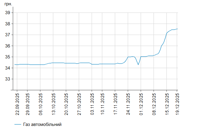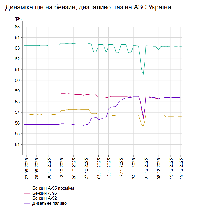 Як повідомлялось, у четвер, 18 грудня, середня ціна на бензин марки А-95 зросла на 2 коп. до 58,36 грн/л, середня ціна на дизельне пальне залишається на рівні 58,41 грн/л.