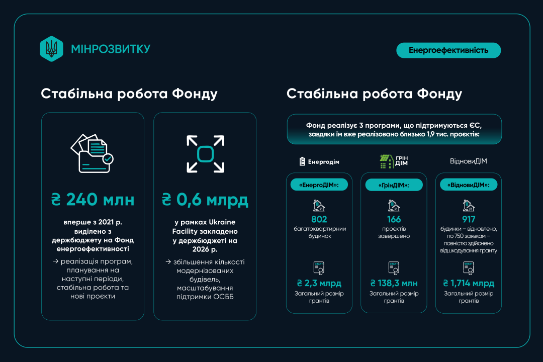 За інформацією міністерства, для забезпечення сталої роботи Фонду наступного року планується залучити нові фінансові ресурси - 60 млн євро кредиту та 60 млн євро грантового фінансування для нової хвилі підтримки багатоквартирних будинків. Це дозволить розширити кількість учасників програм, включно з будівлями у постраждалих регіонах.