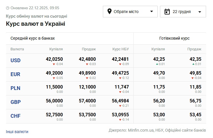 - 1 долар США – 42,24 грн (42,33 грн станом на 19 грудня)