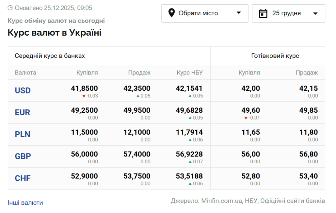 Офіційні курси валют на четвер, 25 грудня, становлять: