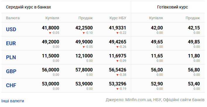 - у monobank: 41,86 - 42,36 грн/$ та 49,33 - 49,95 грн/EUR.