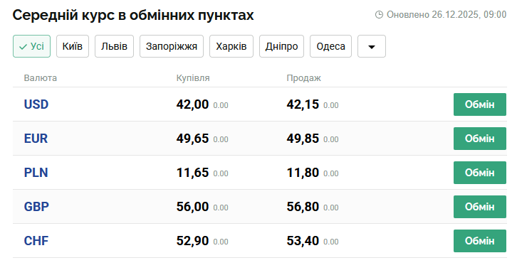- 1 долар США – 41,93 грн (42,15 грн станом на 25 грудня);