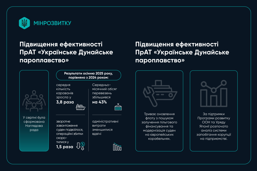 У серпні 2025 року була сформована наглядова рада ПрАТ «Українське Дунайське пароплавство», що стало ключовим кроком у впровадженні сучасних стандартів корпоративного управління. Вже протягом осені це дозволило суттєво оптимізувати роботу річкового вантажного флоту: середня кількість караванів зросла у 3,8 раза, середньомісячний обсяг перевезень збільшився на 43%, а зворотне завантаження суден подвоїлося. Операційні збитки підприємства скоротилися у півтора раза, а адміністративні витрати - вдвічі.
