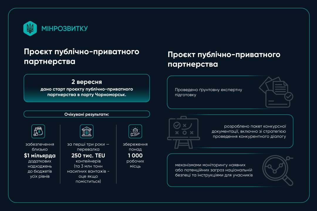 Як повідомлялося, Міністерство розвитку громад та територій оголосило старт концесійного конкурсу для першого та контейнерного терміналів порту Чорноморськ - це має стати найбільшим концесійним проєктом у галузі.