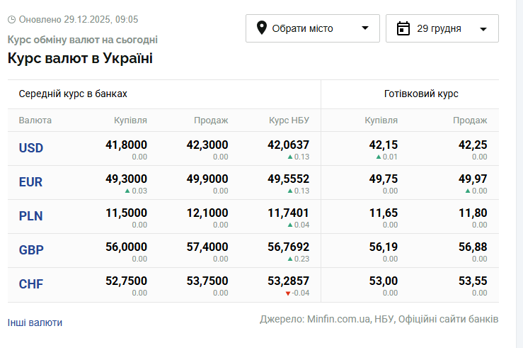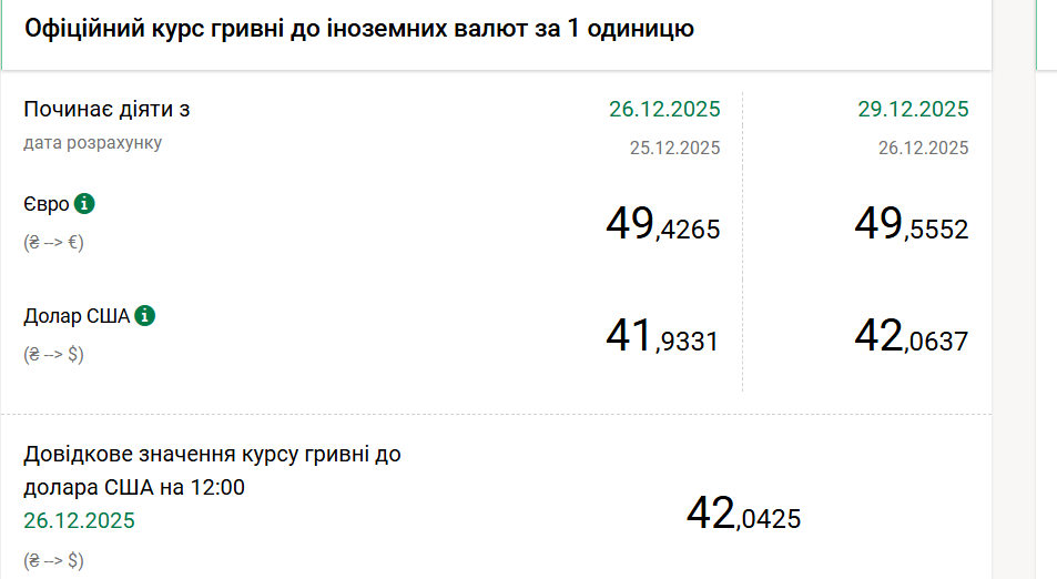 - 1 долар США – 42,06 грн (41,93 грн станом на 26 грудня);