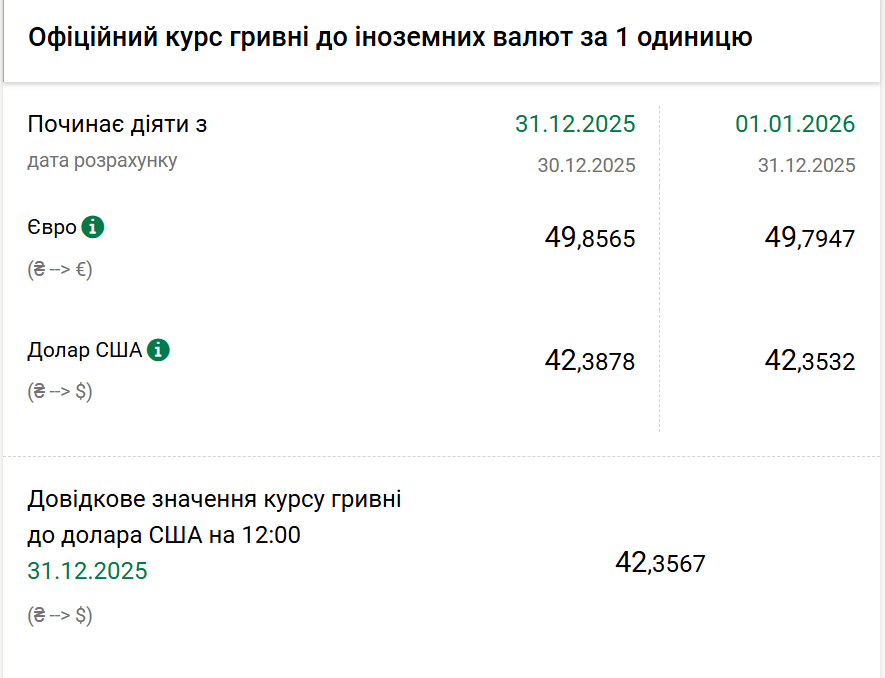 1 долар США – 42,35 грн (42,38 грн станом на 31 грудня);
