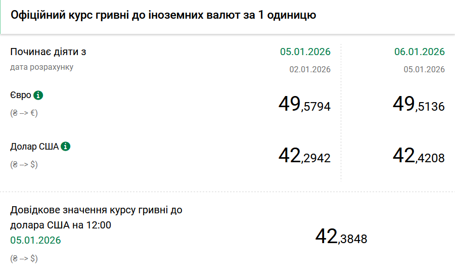 1 долар США – 42,42 грн (42,29 грн станом на 5 січня);