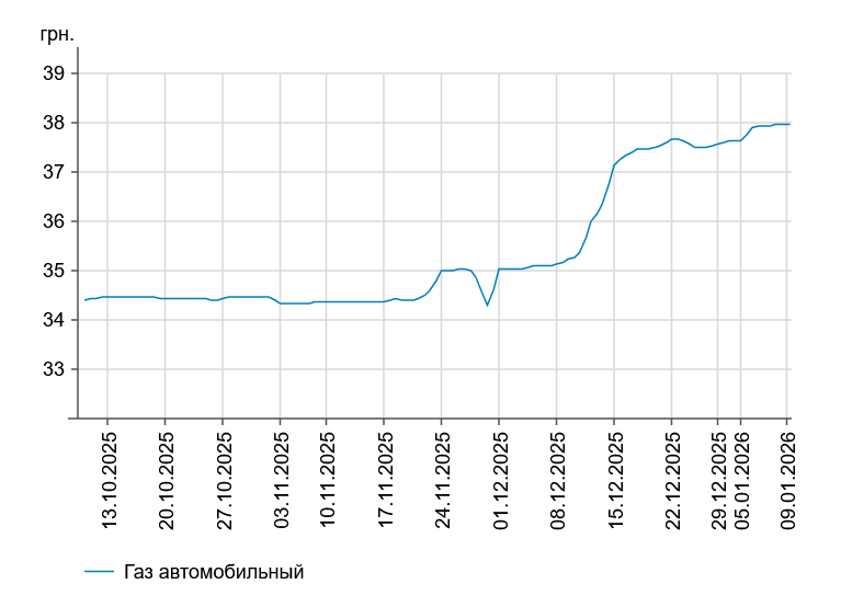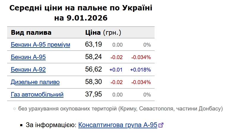 Як повідомлялось, у четвер, 8 січня, середня ціна на бензин марки А-95 зросла на 1 коп. до 58,26 грн/л, на дизельне пальне - також на 1 коп. до 58,32 грн/л.