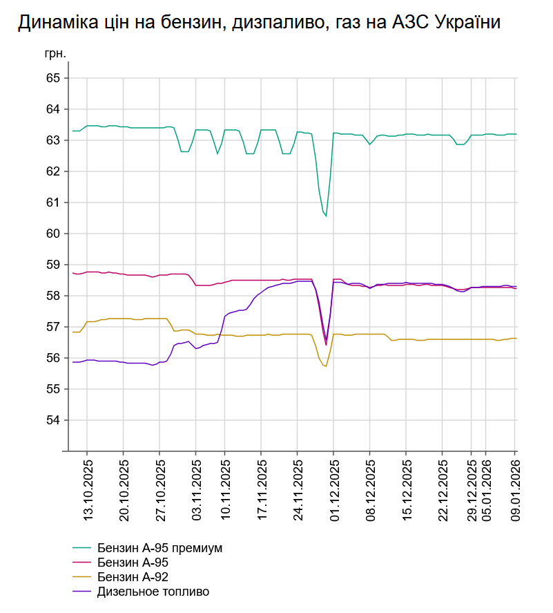 Зокрема, зафіксовано такі середні ціни на пальне: бензин марки А-95 (преміум) - 63,19 грн/л; бензин марки А-95 - 58,24 грн/л (здешевшав на 2 коп.); бензин марки А-92 - 56,62 грн/л (здешевшав на 1 коп.); дизельне пальне - 58,3 грн/л (здешевшало на 2 коп.). Середня ціна автогазу становить 37,95 грн/л - на рівні попереднього дня.