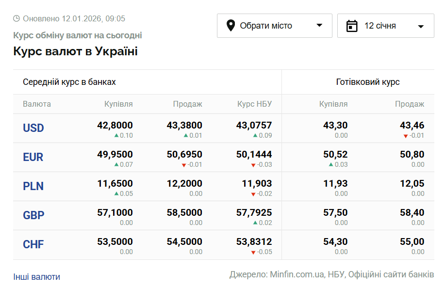 - 1 долар США – 43,07 грн (42,99 грн станом на 9 січня);