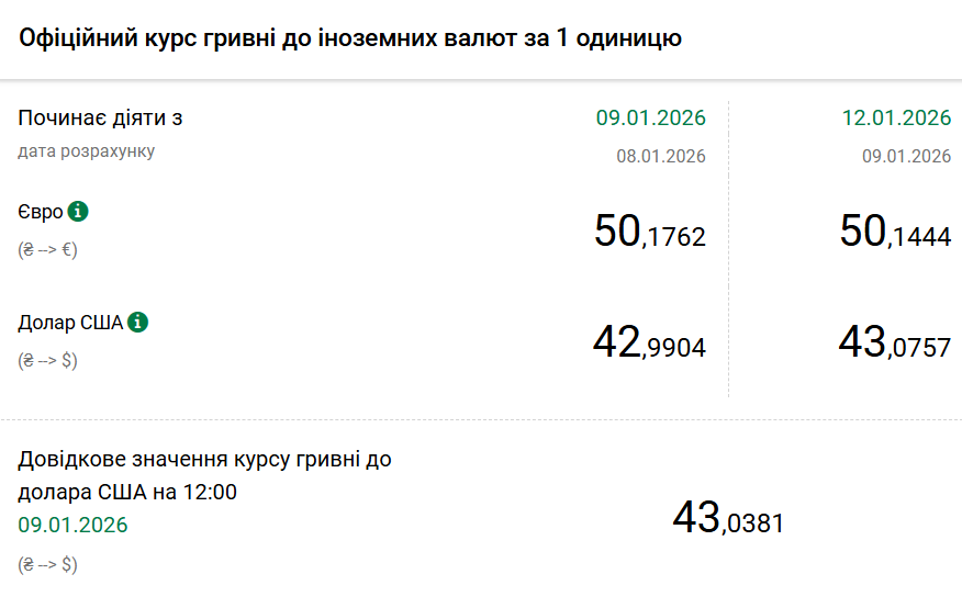 - 1 євро – 50,14 грн (50,17 грн станом на 9 січня).