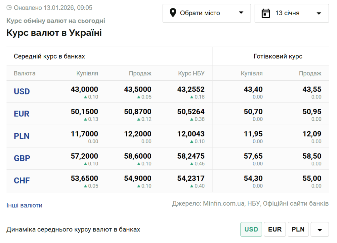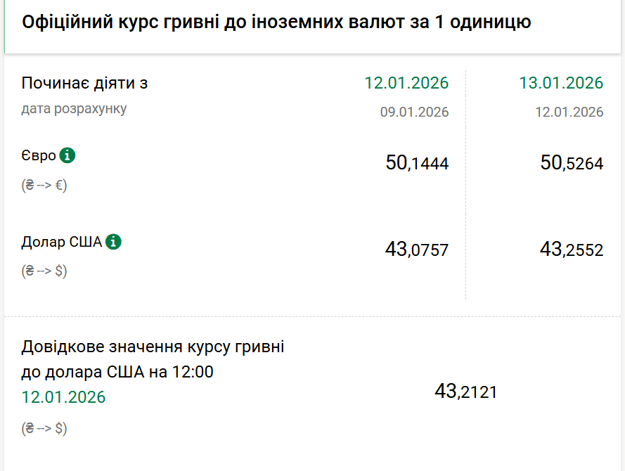 1 долар США – 43,25 грн (43,07 грн станом на 12 січня);