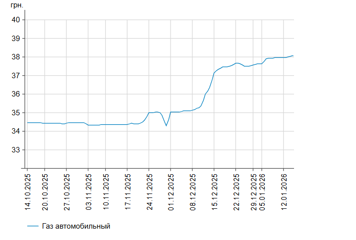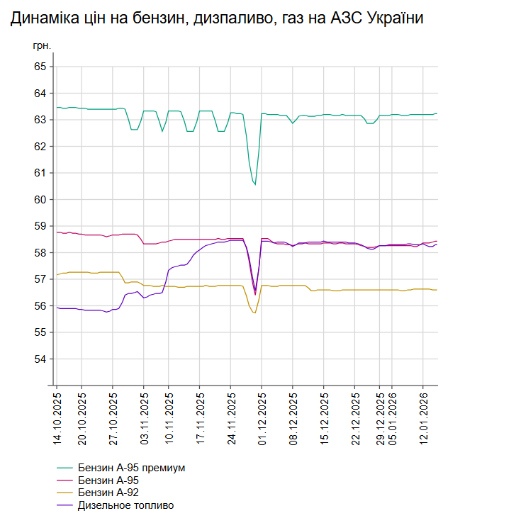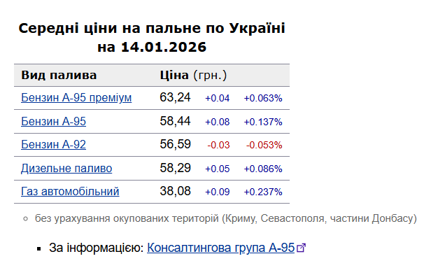Як повідомлялось, у вівторок, 13 січня, середня ціна на бензин марки А-95 знизилася на 1 коп. до 58,36 грн/л, на дизельне пальне - на 8 коп. до 58,24 грн/л.