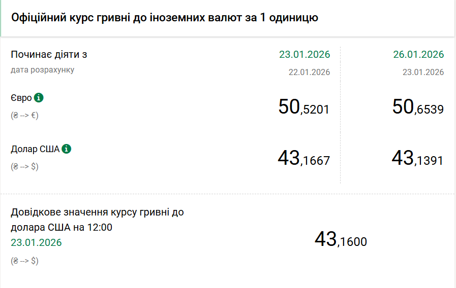 - 1 долар США - 43,13 грн (43,16 грн станом на 23 січня);