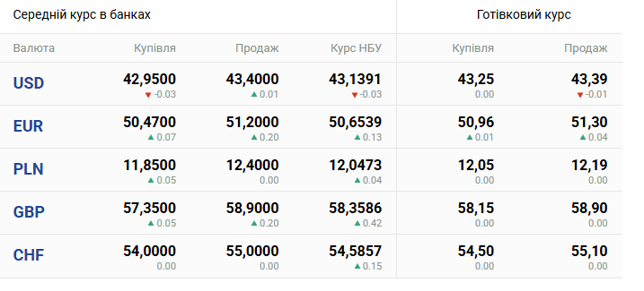 - долар США: 42,95 - 43,40 грн;