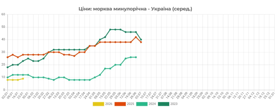 Однак морква в Україні все ще в середньому на 70% дешевша, ніж в аналогічний період минулого року. Більшість експертів прогнозують, що поточне подорожчання є тимчасовим, а більш активного зростання цін слід очікувати ближче до середини весни поточного року.