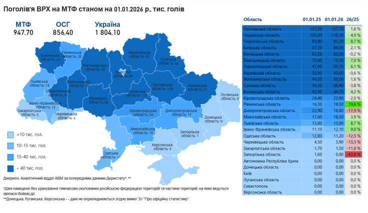 Станом на 1 січня 2026 року в присадибному і промисловому секторі України утримується 1 млн 804,1 тис. голів ВРХ, у тому числі 1 млн 22,3 тис. корів. Порівняно до 1 грудня 2025 року, поголів’я ВРХ в Україні скоротилося на 138,9 тис. голів (-7%), а чисельність корів зменшилася на 53,7 тис. голів (-5%). Порівняно до 1 січня 2025 року поголів’я ВРХ скоротилося на 232 тис. голів (-11%), у тому числі корів – на 158 тис. голів (-13%).