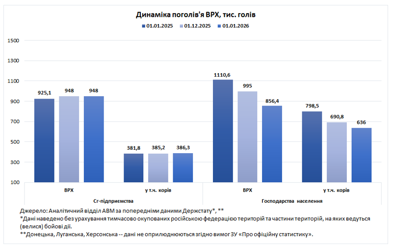 У присадибному секторі знаходиться 856,4 тис. голів ВРХ, що на 139 тис. голів менше (-14%) порівняно до 1 грудня 2025 року. Кількість корів у господарствах населення станом на 1 січня 2026 року становила 636 тис. голів, що на 55 тис. голів менше (-8%), ніж місяць тому. За останній рік кількість ВРХ у господарствах населення скоротилася на 254 тис. голів (-23%), а кількість корів зменшилася на 163 тис. голів (-20%).
